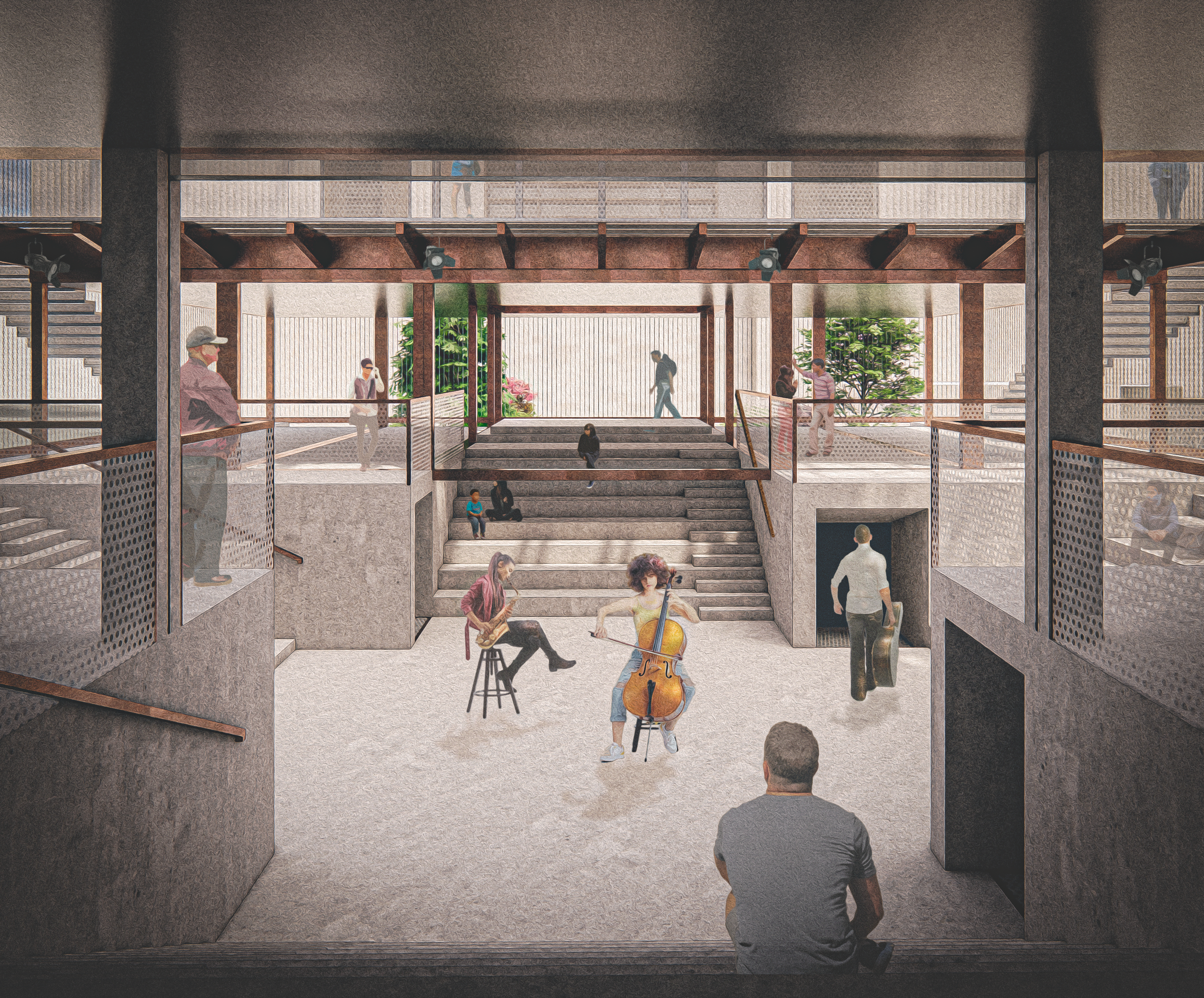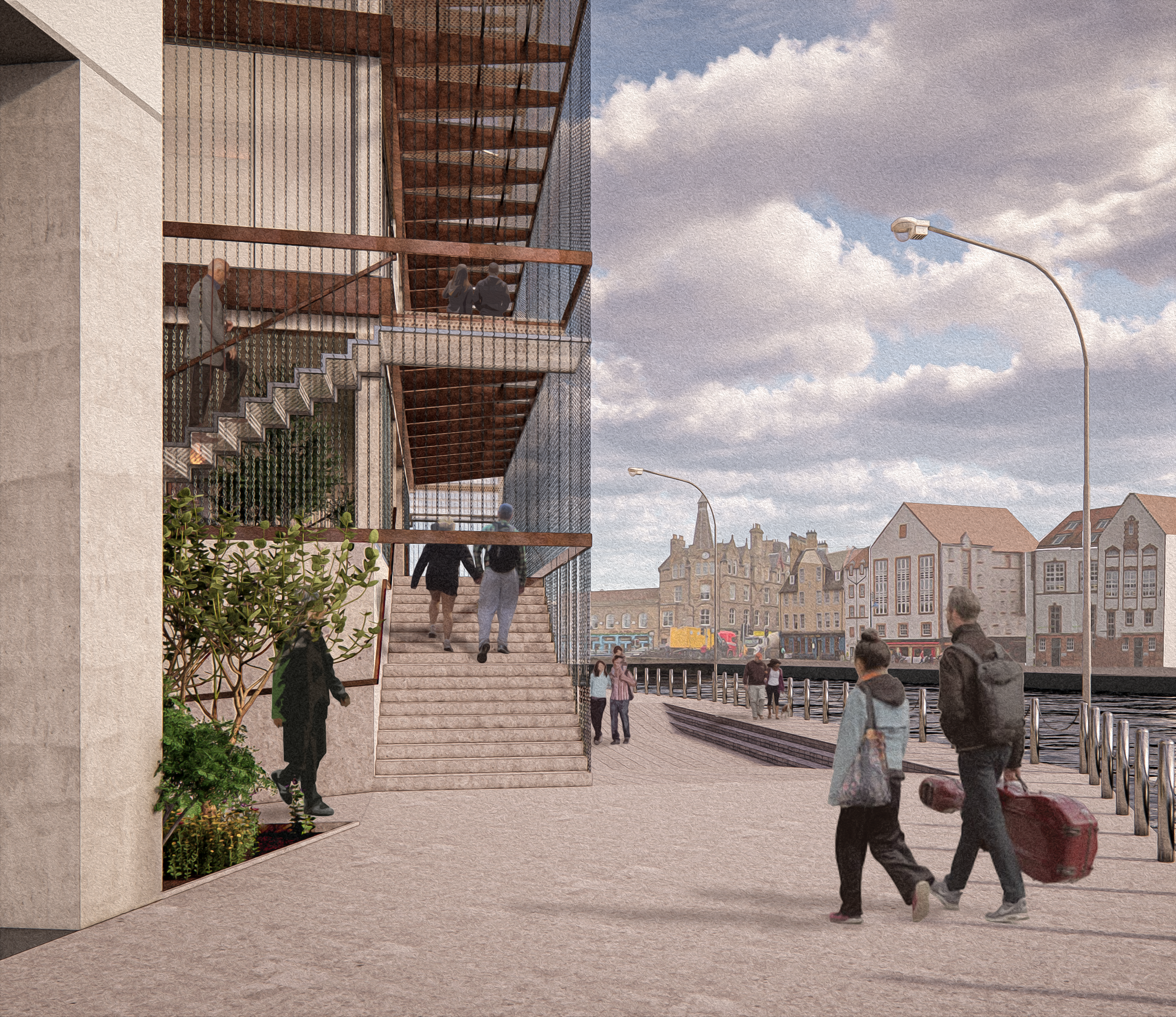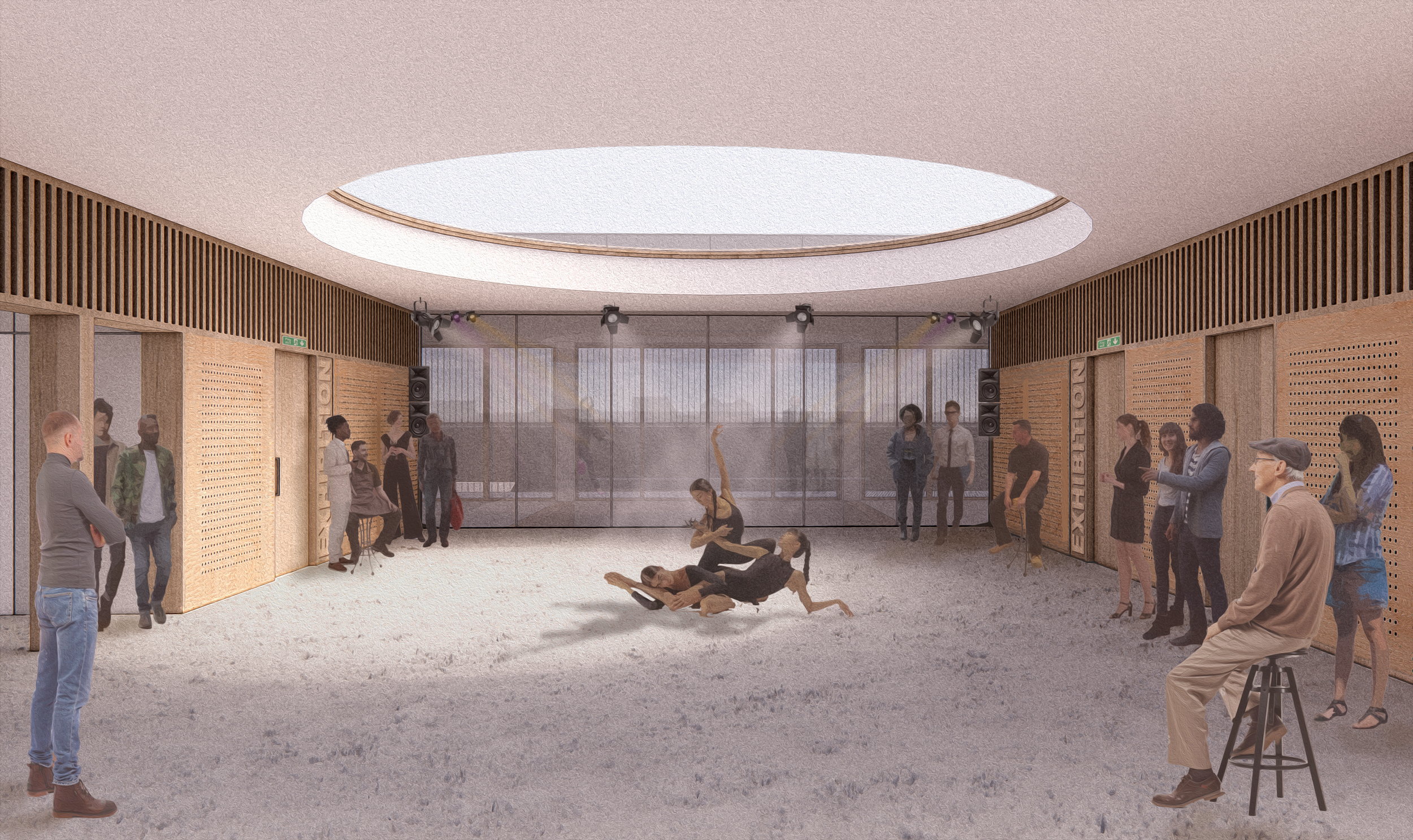 The Beacon on the Water of Leith was a response to the needs of Leith Theatre Group, a charitable organisation founded to support the historic Leith Theatre building when it was threatened to be demolished and replaced. The site along the river presented an opportunity to garner attention from a busier and more developed area of town. Situated here, the building essentially begins a trail of interest for the public, leading pedestrians towards the theatre complex and therefore reactivating the route into the town. The trail features a range of instrumental urban interventions, each of which ascending in scale, difficulty, and degree of engagement, until ultimately arriving at the destination; Leith Theatre. The Beacon not only ignites engagement for the existing theatre complex, but also provides an accessible local platform for young and undiscovered artists to take their first step on the ladder, both in teaching and performance; reinforcing a mutually beneficial exchange between the amateur and the artist.