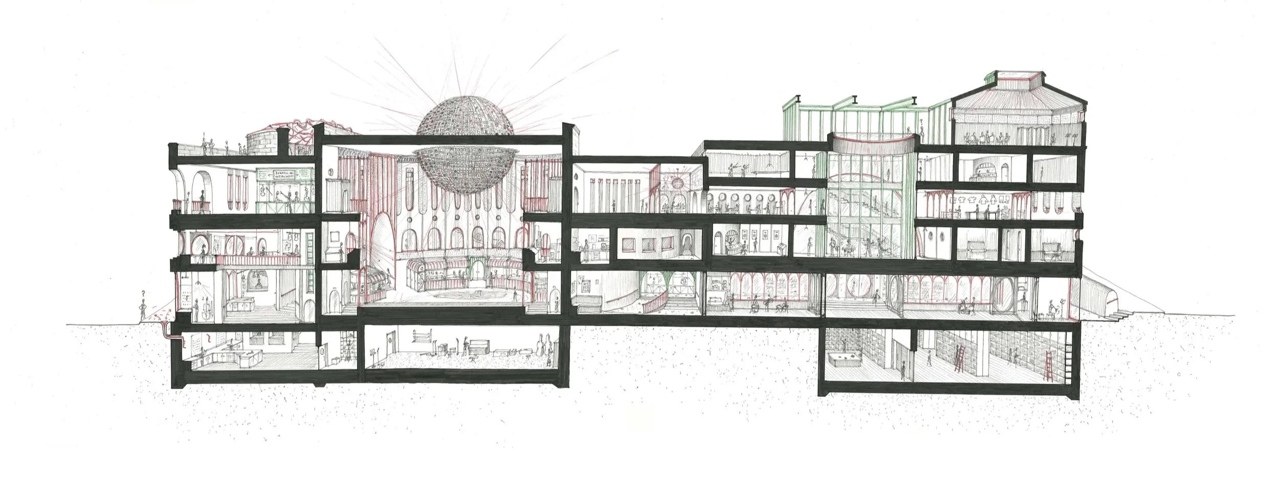The microcosm proposes a condensed city of music within the foot print of the existing ABC and its neighbour, formerly ABC 1. The building is host to all things music; spaces for practise, teaching, recording, producing and performance, instrument making, and archives of books, CDs and vinyl. Central to the layout is the ballroom, the multi-purpose heart of the microcosm. Here, users can rehearse and perform, and craftspeople have a platform to sell and exchange their skills and service to others in the community. Its varied uses keep it in constant activity, drawing in the public whilst benefiting the local musicians and industrians.