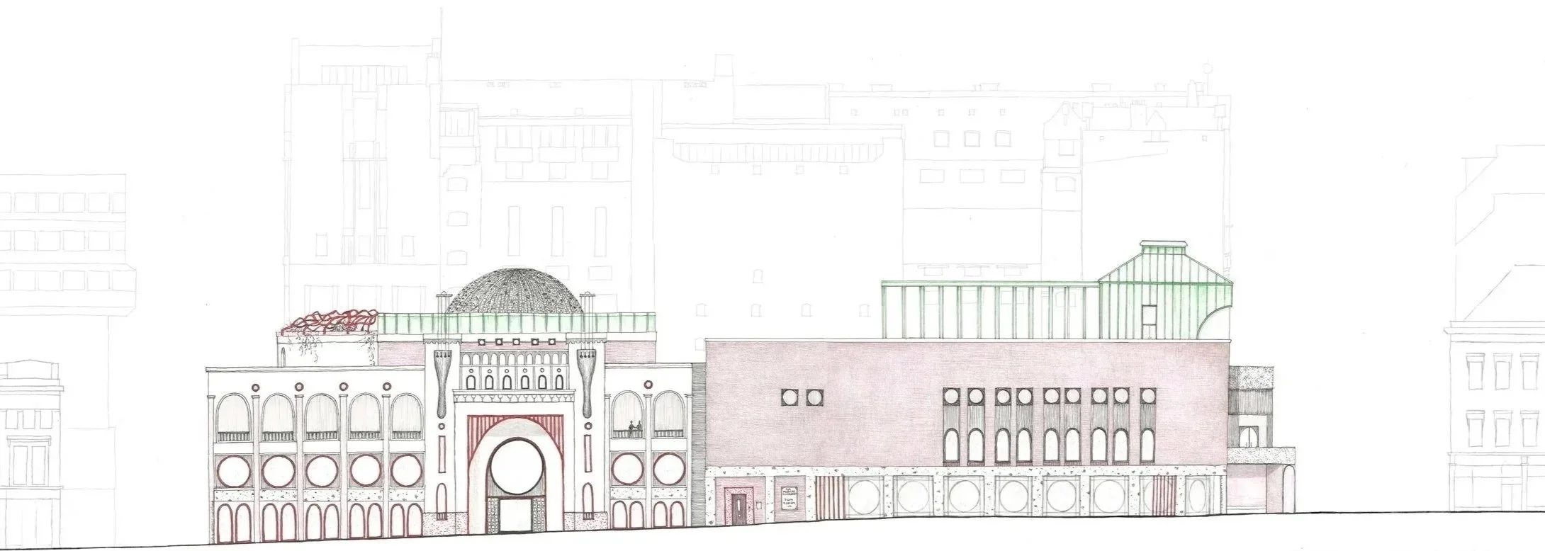 The disco ball is a symbol of fun, music, dance, and communal celebration. Its simple geometry catches and reflects light in every direction, creating a familiar atmosphere of energy and shared experience. I began noticing it everywhere in Glasgow, not just in venues like St Luke’s and Barrowlands (and the former ABC), but also in cafes, restaurants and bars. In the microcosm’s central space, the disco ball becomes more than decoration; it manifests as a central architectural element. The large glass globe skylight, sits above the “ball”room. The market surrounds it, facing the stage, and the full height volume reinforces the idea that the rest of the programme revolves around this place of gathering.