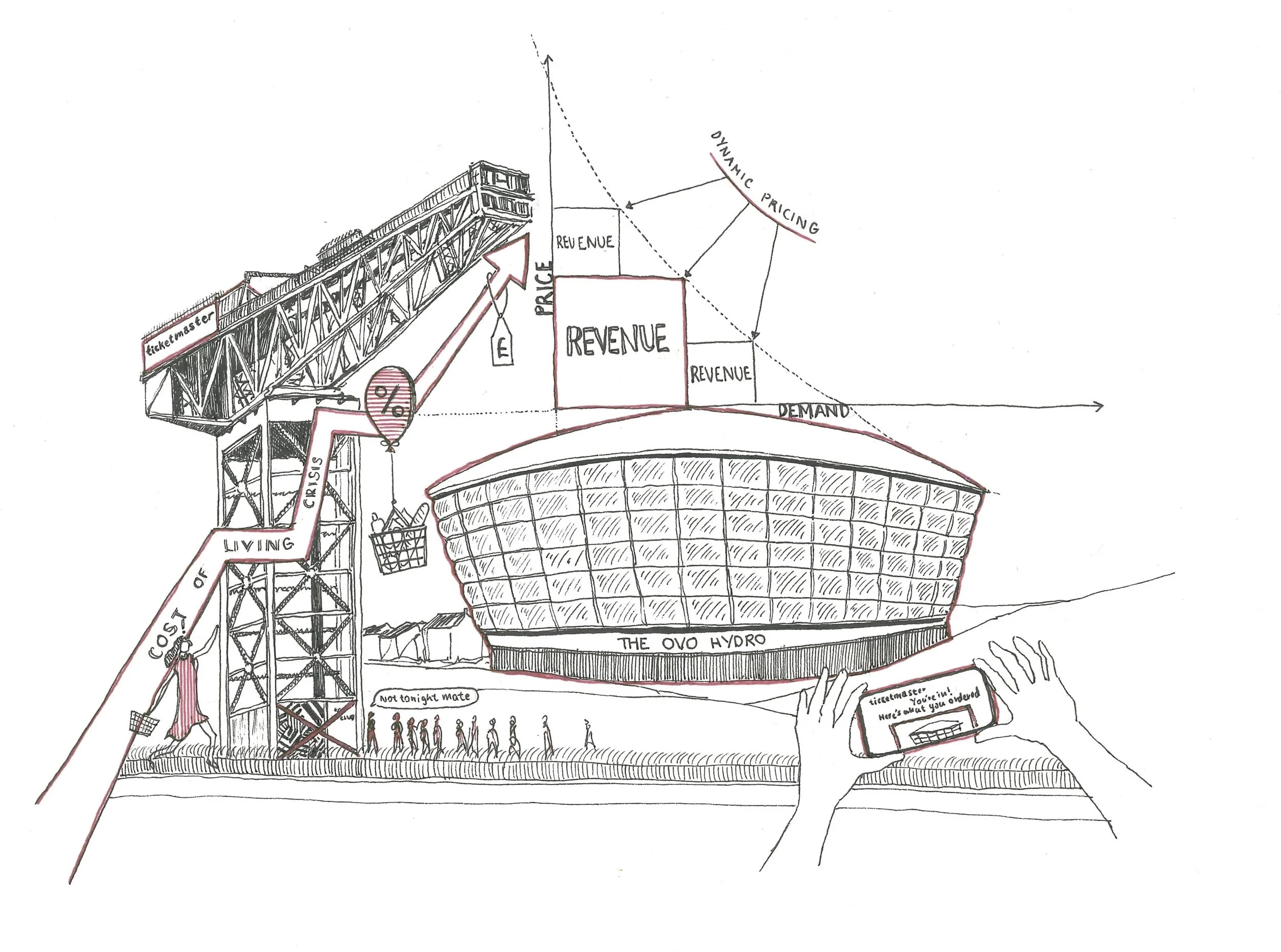 Several key trends have caused struggles for grassroots venues, musicians and even fans. A shift in scale is the common denominator: stadium shows have risen in popularity as artists can charge more and fit more fans in. This is largely due to event companies like Ticketmaster, who control mandatory charges on tickets; causing musicians to earn less, and concert goers to pay more. The increased use of the dynamic pricing model (as opposed to static) has contributed to people paying as much as game consoles for a single ticket, which highlights the financial inaccessibility of the music scene in the modern day. The move away from the small venue, paired with current cost of living issues, has forced numerous venues to closure.
