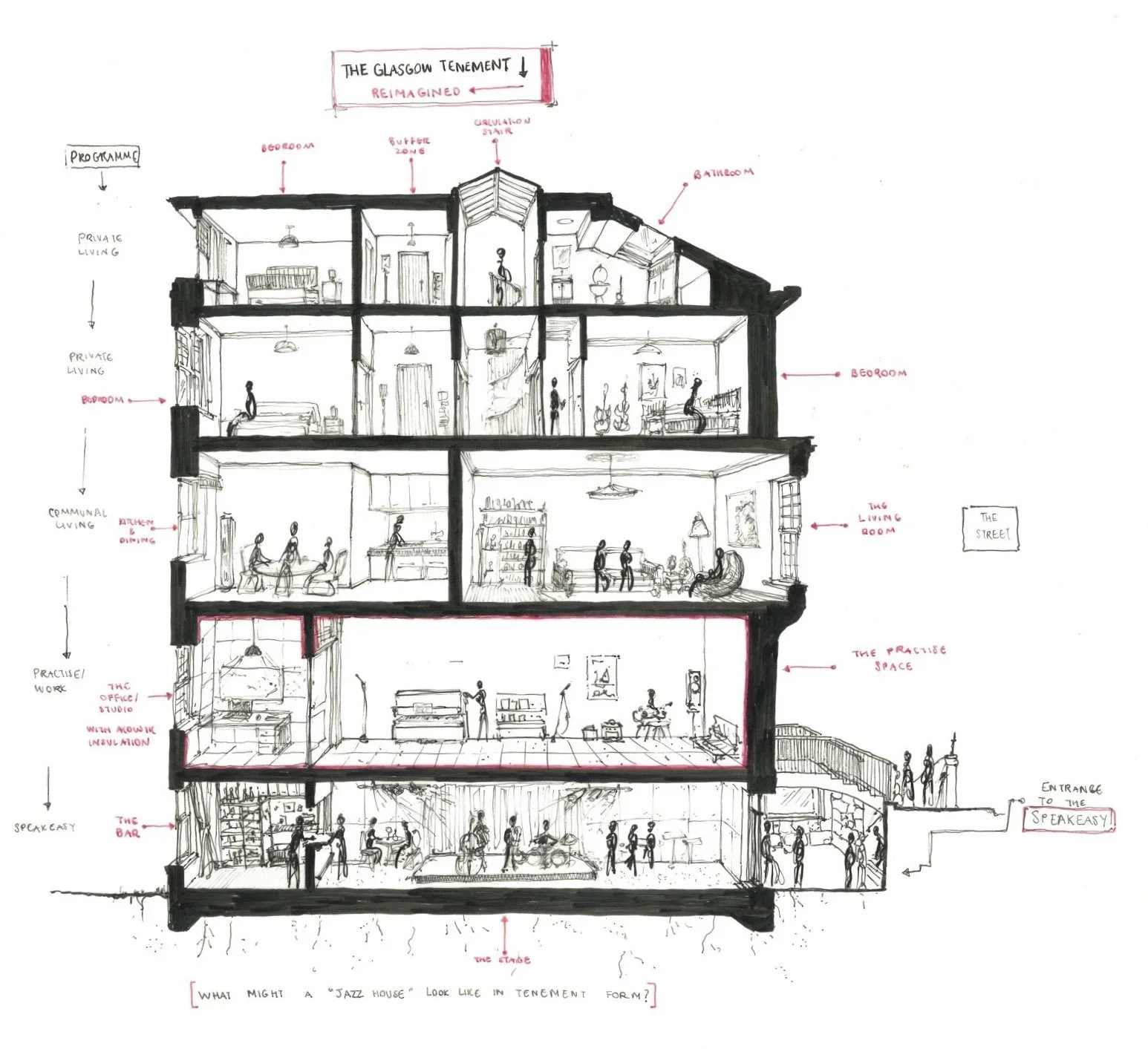 The jazz house in Glasgow is based on the small scale house share concept amongst musicians but imagined on a larger scale. The proposition to be tested is a musical living and working typology that fits into Glasgow’s most common residential typology: the tenement. This line of inquiry hypothesises that this new mode of living would help support young, struggling, or grassroots musicians. Living in close quarters to other musicians of different skills could help individuals grow educationally and socially.